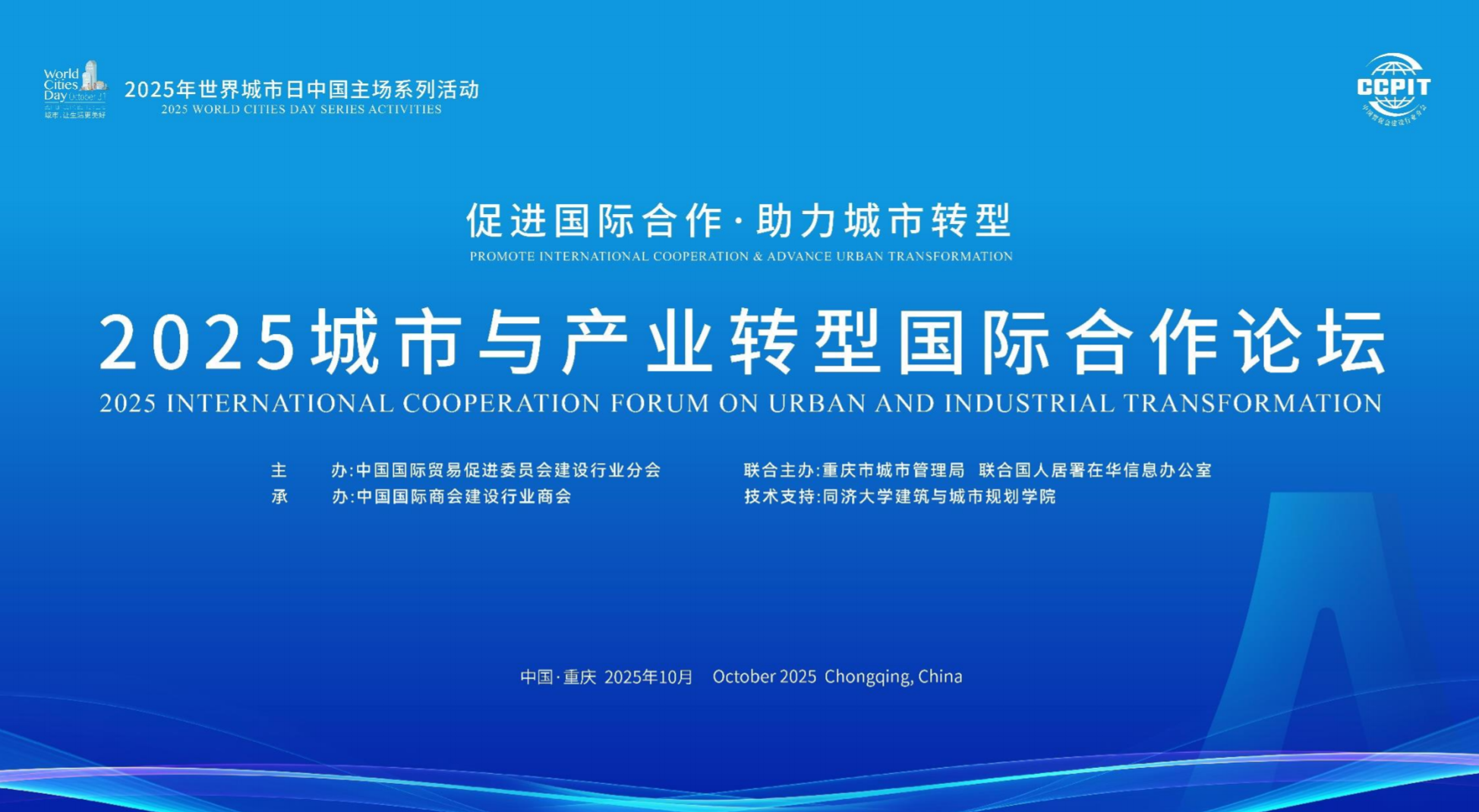 2025城市与产业转型国际合作论坛作为今年世界城市日中国主场系列活动之一,以“促进国际合作·助力城市转型”为主题,由中国国际贸易促进委员会建设行业分会(以下简称中国建设行业贸促会)、重庆市城市管理局、联合国人居署在华信息办公室联合主办,中国国际商会建设行业商会承办,同济大学建筑与城市规划学院提供技术支持。住房和城乡建设部相关司局领导、联合国人居署官员、重庆市城市管理局领导,以及中外院士、行业龙头企业负责人及中国建设行业贸促会副会长单位、常务理事单位和理事单位在内的百余名中外行业资深人士出席会议。